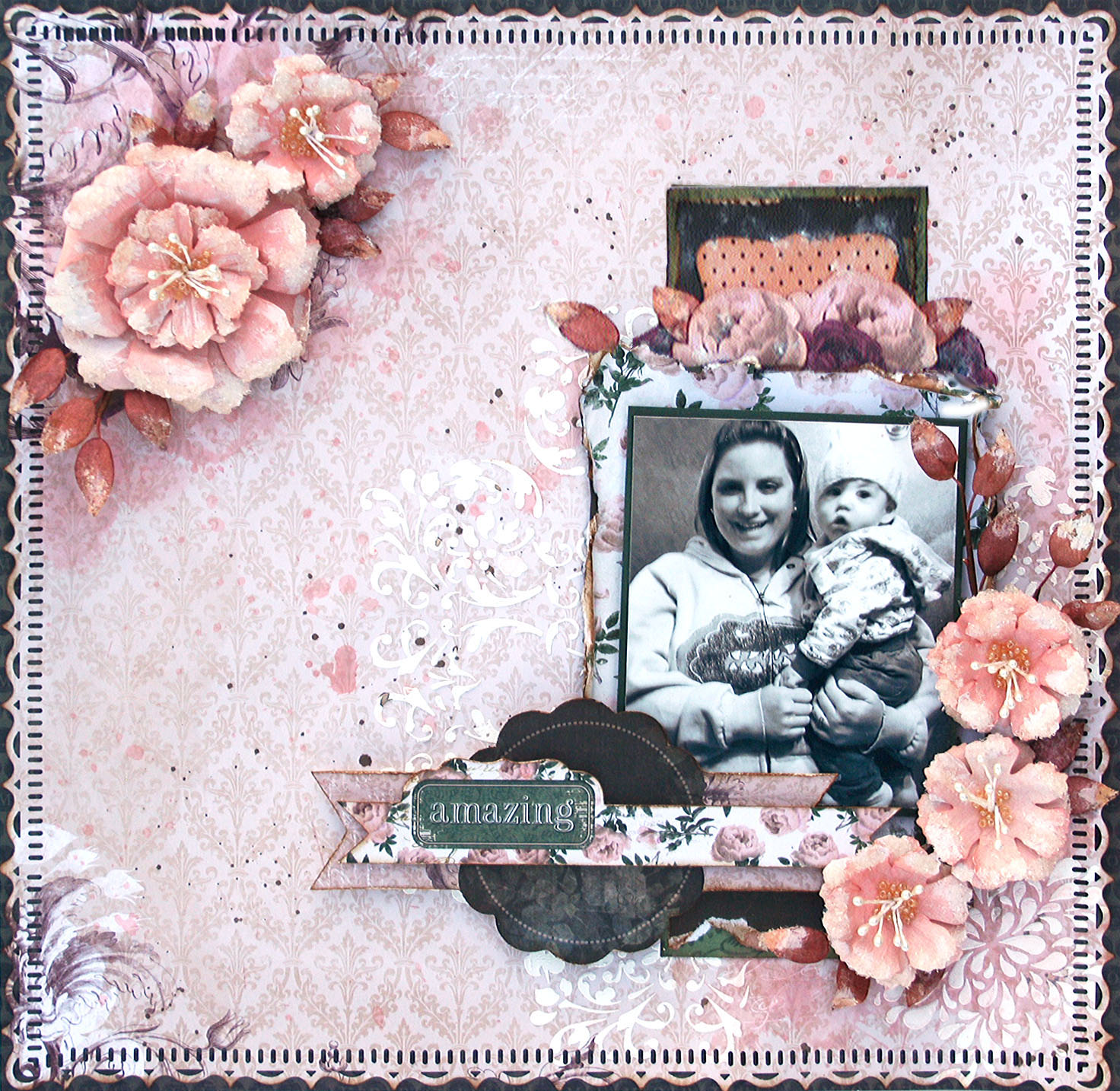 The Swirlydoos December kit was filled with gorgeous papers from Bo Bunny's Rose Cafe collection. Here I've layered some scraps under the photo and added some journal pieces from the Rose Cafe collection Noteworthy Journal cards at the bottom of the photo.
